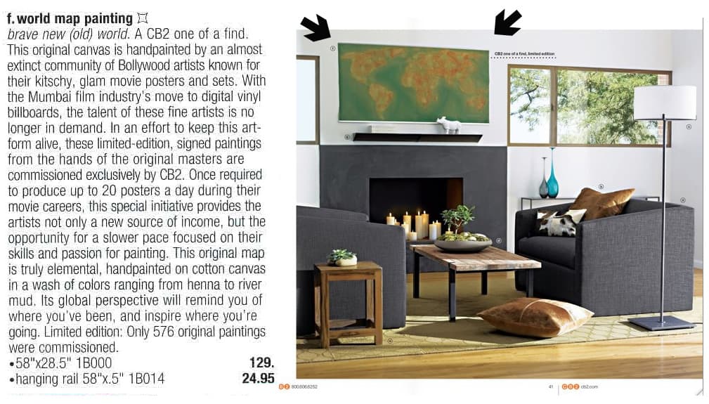 Turns out the talents of artists like Singh have been snatched up by CB2 — the younger, hipper offshoot of home dcor staple Crate and Barrel. “In an effort to keep this art-form alive,” the company offered “limited-edition, signed paintings … on cotton canvas in a wash of colors ranging from henna to river mud.”