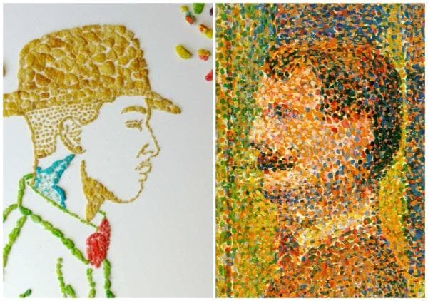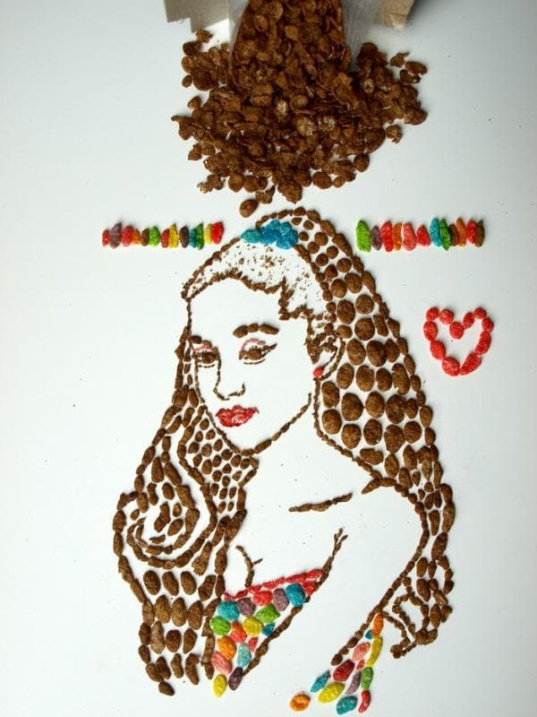 Rosado’s medium might seem gimmicky, but the intricacy of assembly is what makes these images stand out. IfGeorges Seurat had FruityPebbles (and a camera) lying around, he might have ended up with something like this portrait of Pharrell: