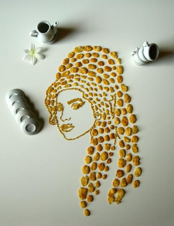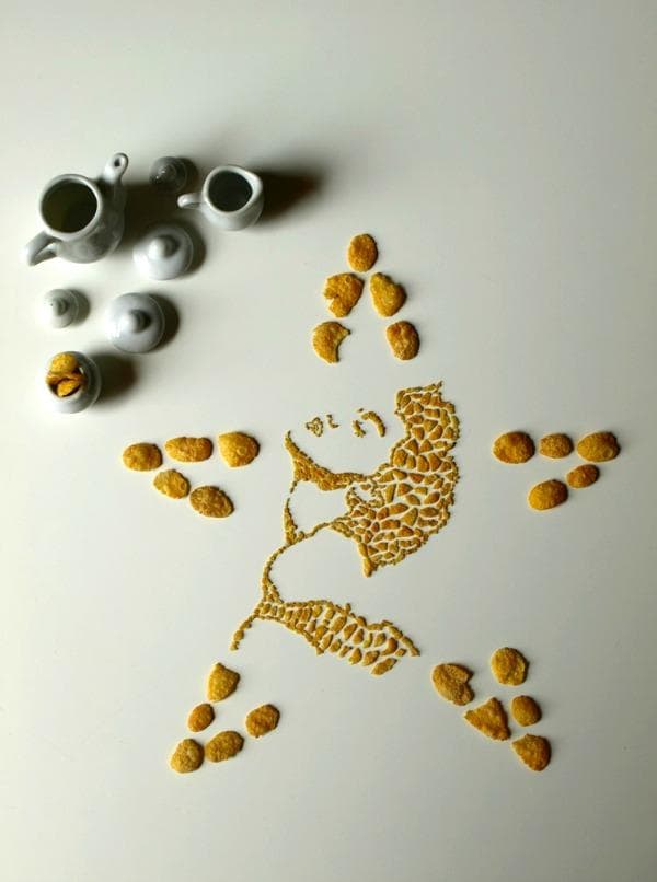 Cereal isn’t nearly as buzzy asSerial, butSarah Rosadois trying to change that one corn flake at a time.The Manhattan-based artist makes portraits byshaping breakfast cereal (minus the milk) into portraits of pop music’s most recognizable faces:Amy Winehouse, Stevie Wonder, Michael Jackson, and many more.