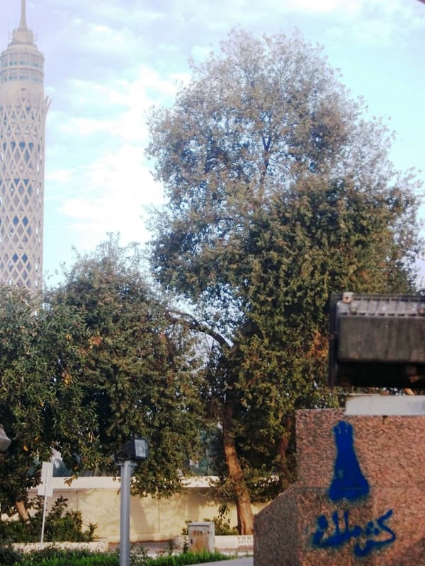 Qasr al-Nil bridge in downtown Cairo. Over “Facebook” is the Arabic for “Police are the thieves,” to its left “Down with Mubarak.”