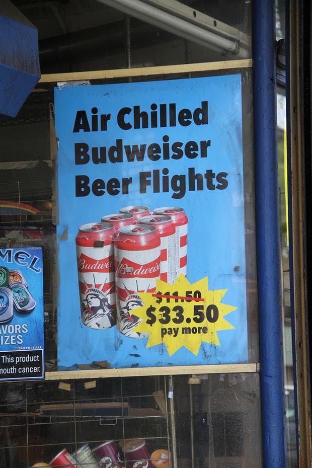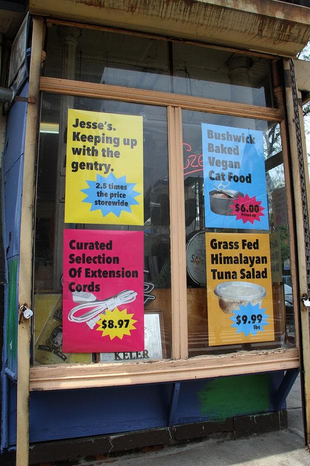 Who wouldn’t jump at “Grass Fed Himalayan Tuna Salad” for $9.99/lb? Or “Air Chilled Budweiser Beer Flights,” once $11.50, now going for $33.50? From “Seasonal AA Battery Medley” to a “Curated Selection of Extension Cords,” this is the sassiest and most ingenious response to the skyrocketing rents that come with urban gentrification that we’ve seen. When life hands you lemons, get someone with a good sense of humor on your side.