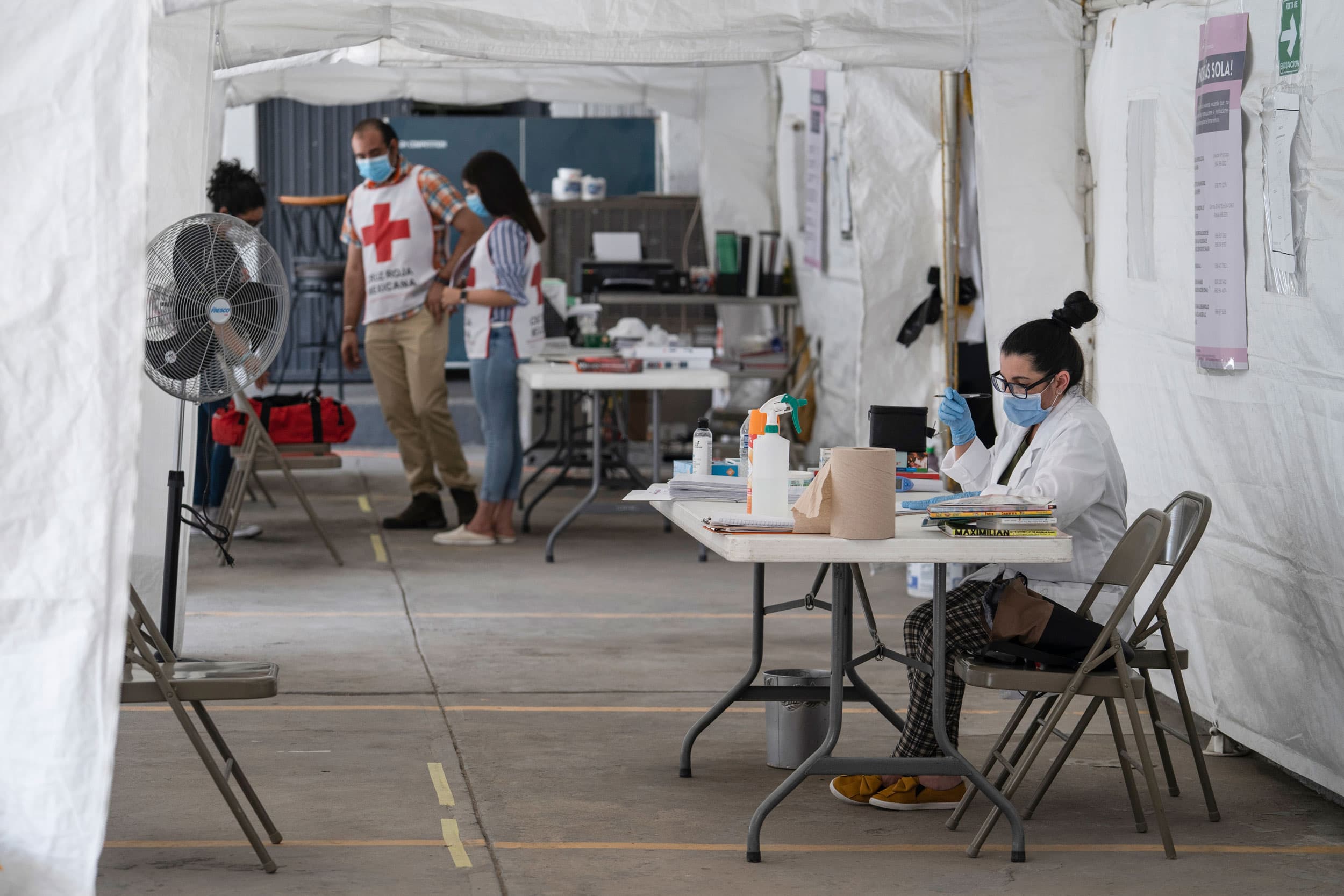 Volunteers work on May 30, 2020 at Hotel Filtro in Ciudad Juárez in the state of Chihuahua, Mexico. On the second level of the hotel, a doctor attends migrants in observation, either because they were exposed or are at high risk for COVID-19.