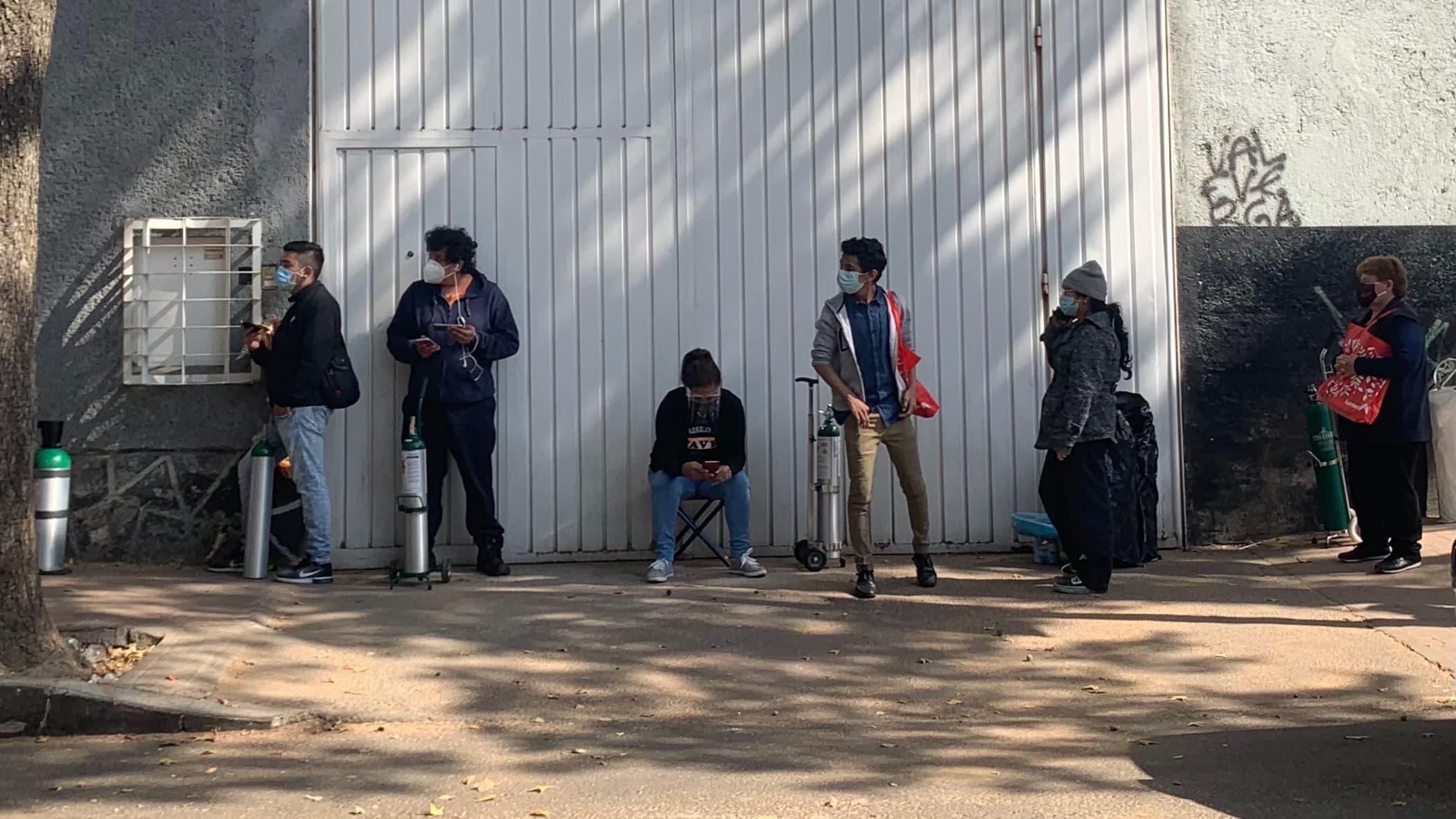 People wait in a long line at an oxygen distribution warehouse near downtown Mexico City.