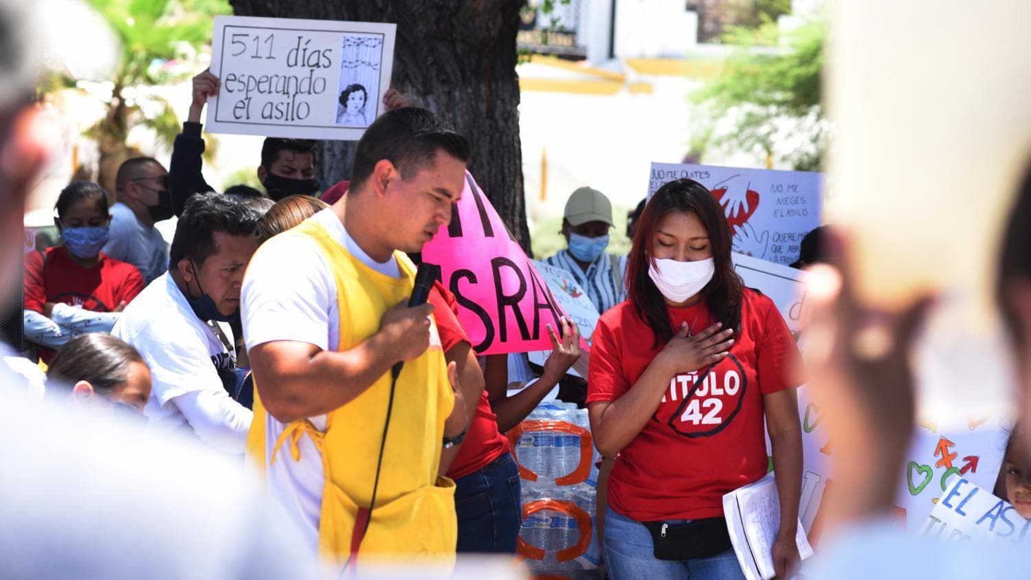 Last Monday morning, some 400 asylum-seekers gathered around a megaphone in a little plaza shaded by old trees in the northern Mexican city of Nogales, Sonora, just across the street from the border crossing into the US.