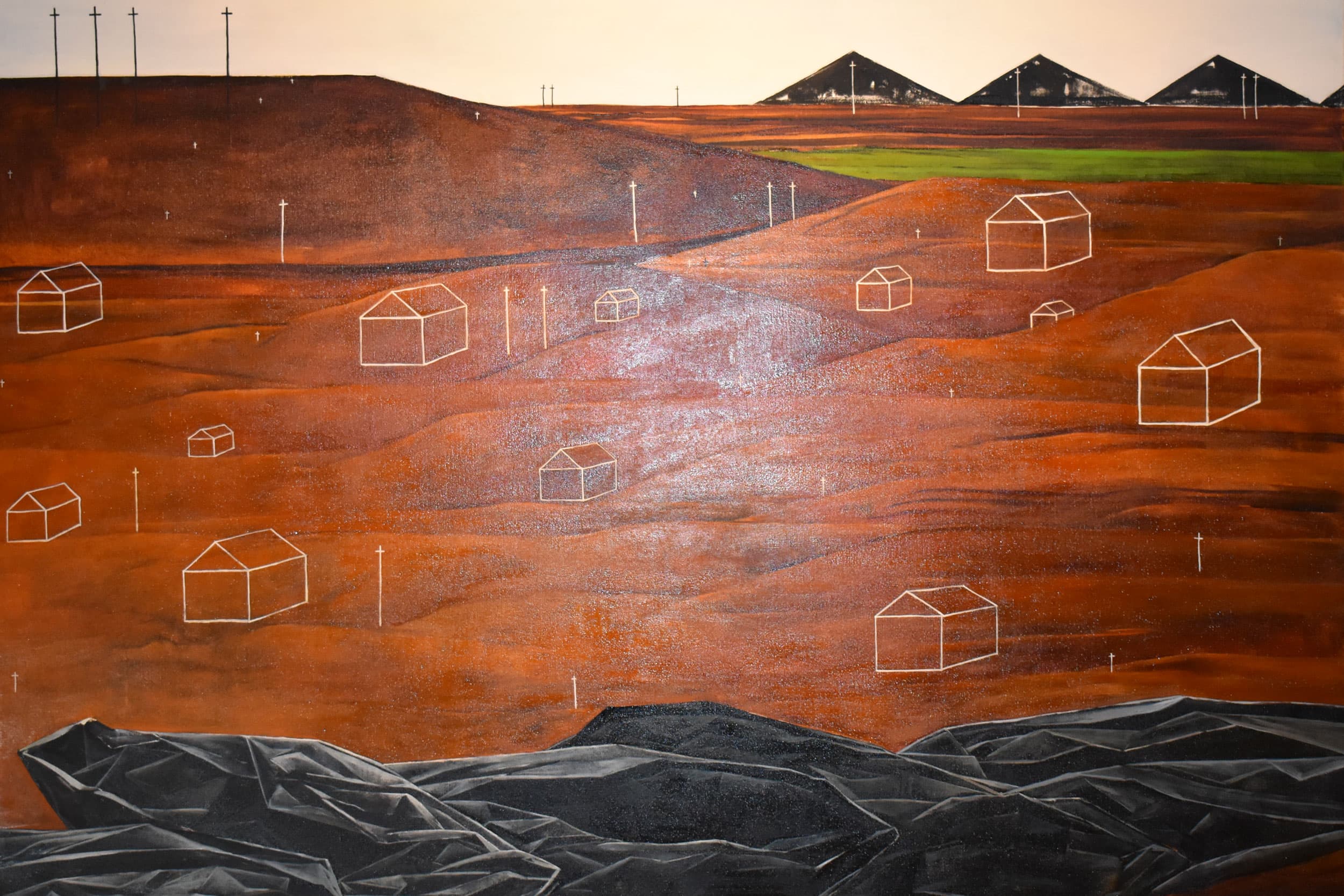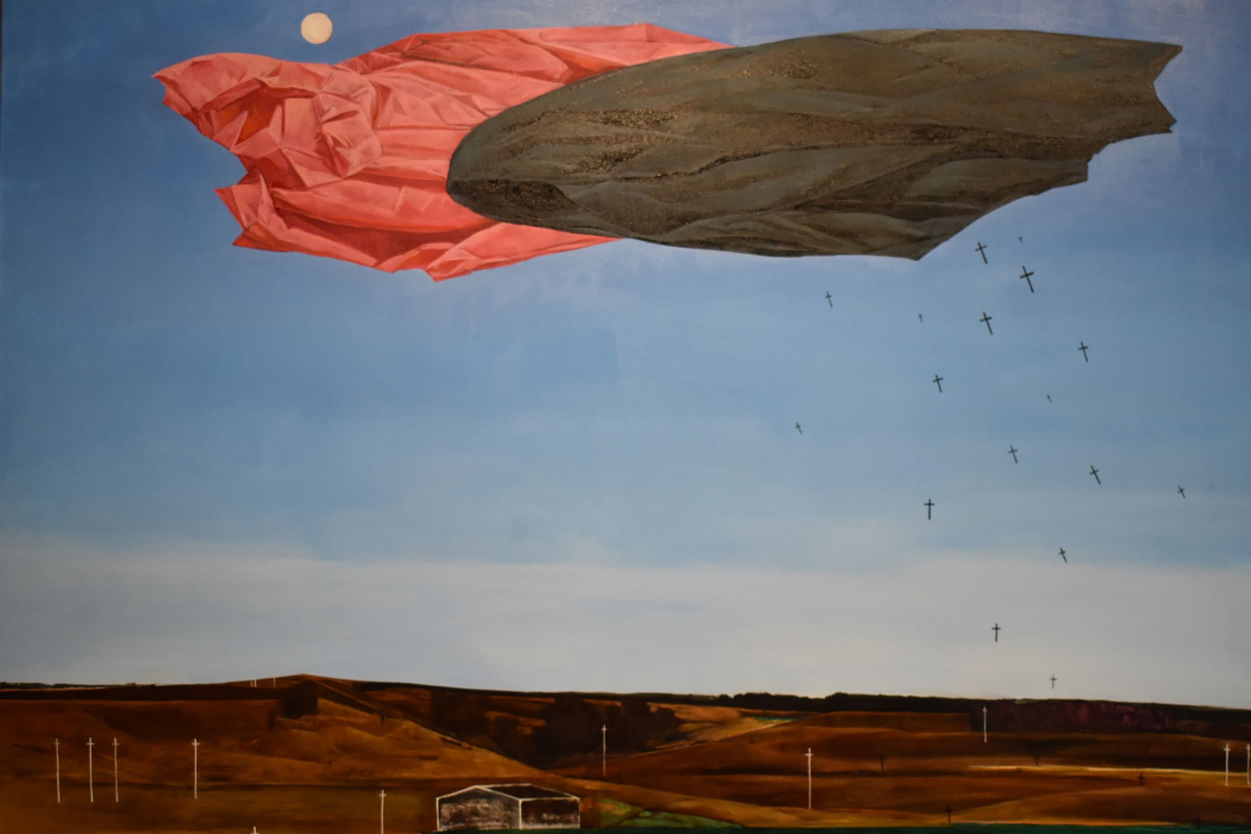 The painting, “Desert,” depicts a world of empty houses, crosses and body bags for the dead. The artist contemplates what life may be like in a postwar landscape, and whether it may ever be safe again, Popovych said.