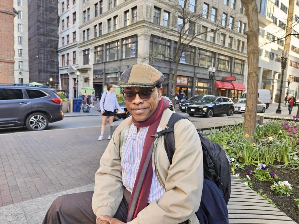Charlot Lucien sits across the street from the Old State House.Esteban Bustillos/GBH News