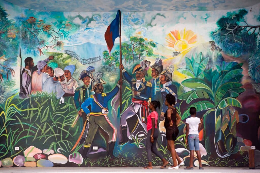 Residents look at a mural depicting the independence heroes ahead of the Flag Day celebrations in Arcahaie, Haiti, May 14, 2018.Dieu Nalio Chery/AP