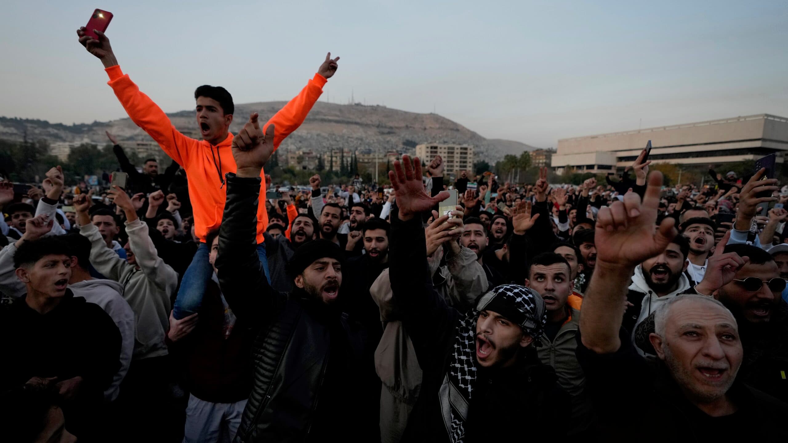 Syrian citizens celebrate during the second day of the take over of the city by the insurgents in Damascus, Syria, Dec. 9, 2024.