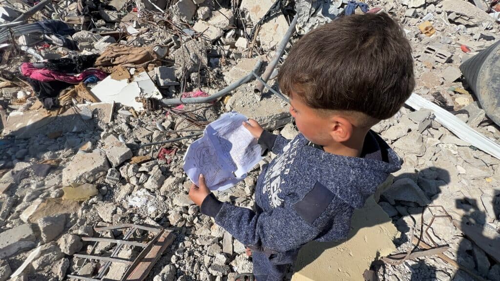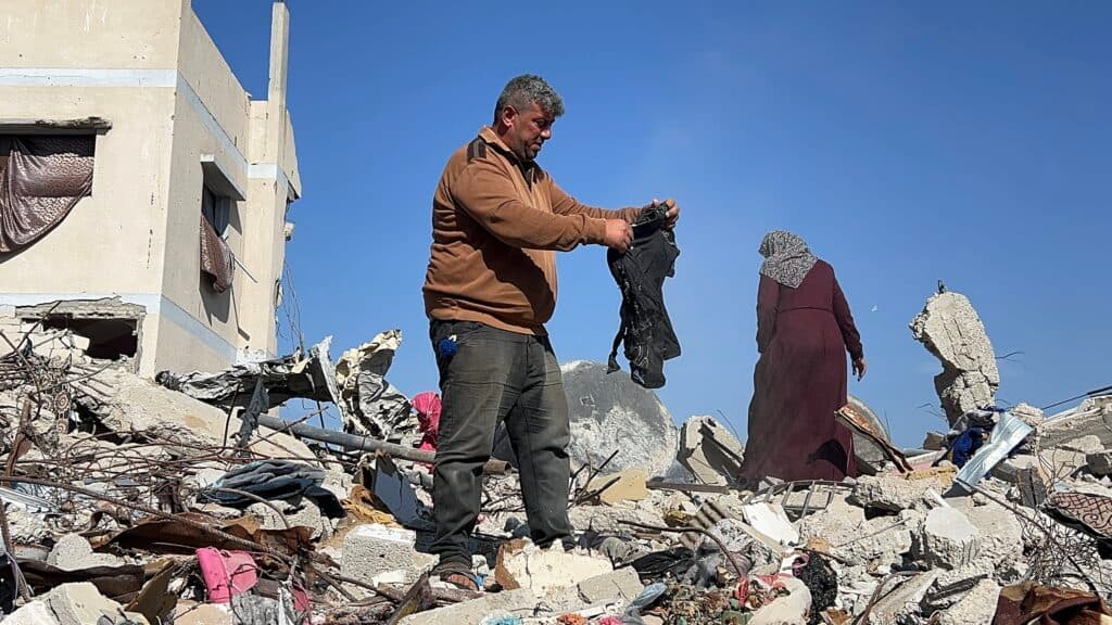 The Abu Rizq family searches through the rubble of their home in Rafah, in southern Gaza. They were able to return as the ceasefire between Hamas and Israel came into effect in January.