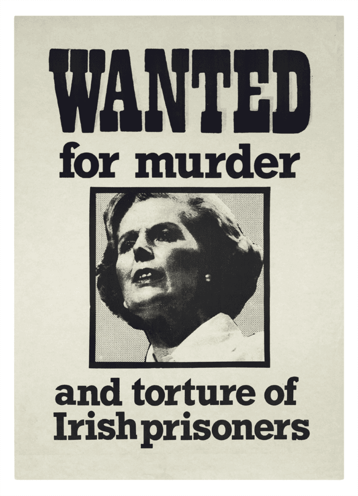 This British anti-Thatcher poster (1981) was published during the hunger strikes in Northern Ireland, undertaken by Irish Republican prisoners between 1980 and 1981 in protest at the government’s withdrawal of their status as political prisoners.Courtesy of FUEL Publishing