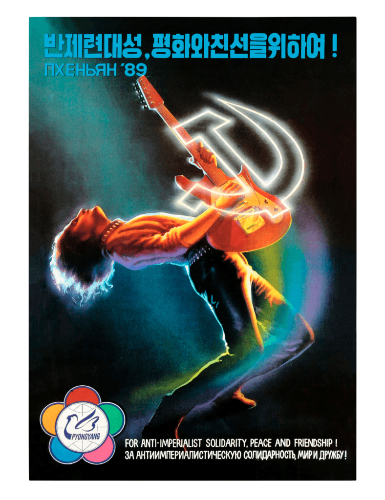 Bradley, I wanted to get to a specific example of a North Korean promotional poster from 1989 that’s in your book. It is for a world youth festival taking place in Pyongyang. And it looks like a Western concert poster. It’s got a guitarist and kind of a Jimi Hendrix pose, some real ’80s psychedelic colors. There is the image of a hammer and sickle imposed on top of the electric guitar, though, and it says in both English and Russian, “For anti-imperialist solidarity, peace and friendship.” So, I’m wondering who the intended audience for that poster was.