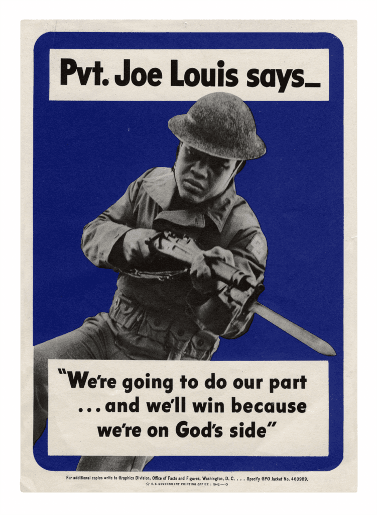 That was a very famous poster. Louis was heavyweight champion in the 1930s, and he famously was knocked out during a match in Nazi Germany in the first round of a boxing match. But in the 1938 rematch, which is one of the most important matches in boxing history, it lasted just two minutes of four seconds and Joe Louis went in with a with a knockout. And this was one of the events that really got him in the public eye. He fought a number of fundraising matches prior to joining the Army in 1942, I believe.