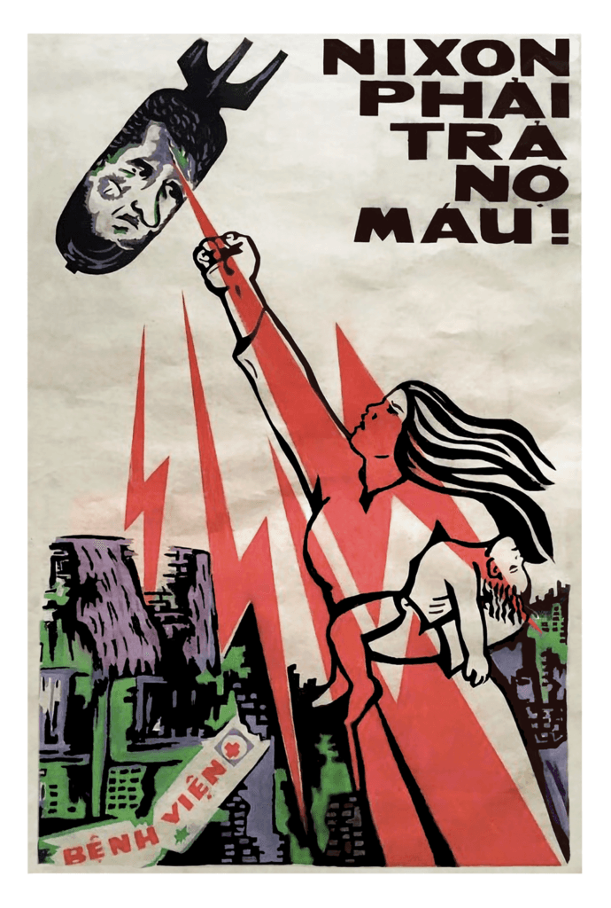 “Nixon must pay for our blood with his blood!” One of the most famous and reproduced designs of the Vietnam War, c.1972. It was likely published during, or in the wake of, Operation Linebacker II – an intense B-52 bombing campaign that sought to destroy major targets in the north.Courtesy of FUEL Publishing