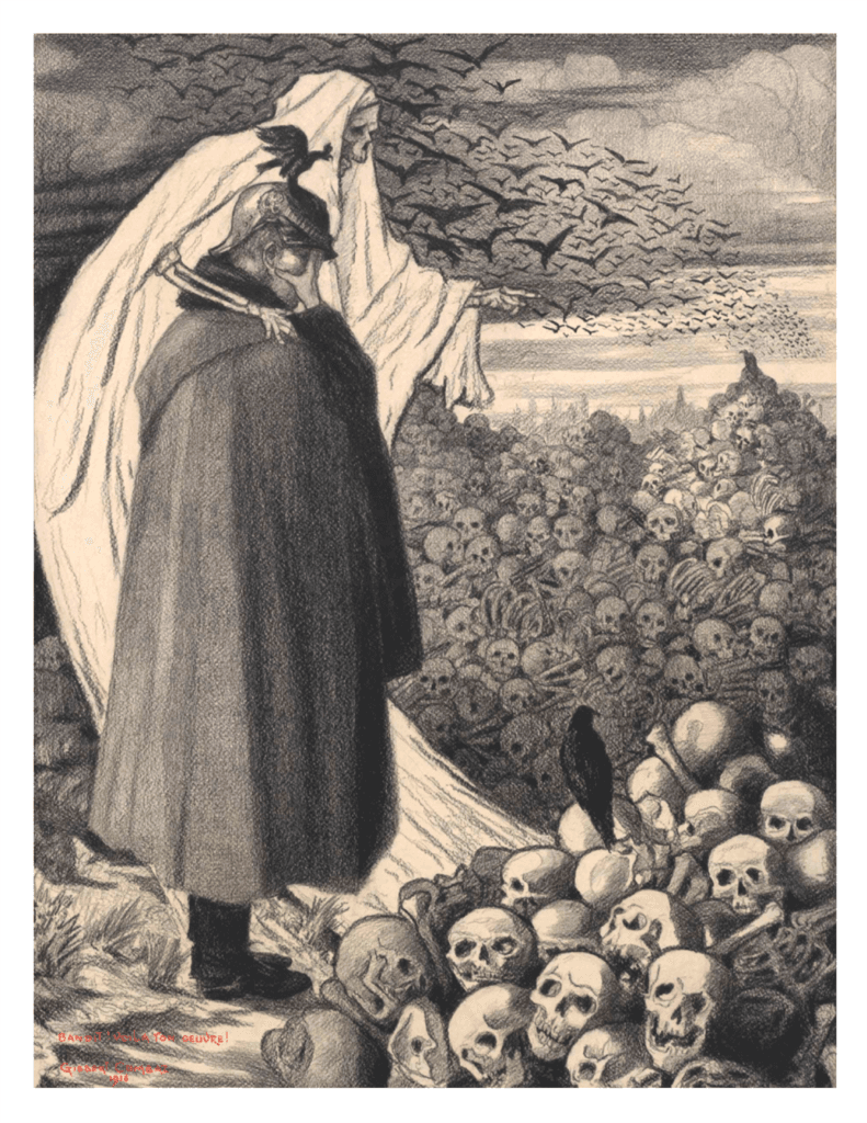 “Villain! Behold your work!” The figure of Death shows Kaiser Wilhelm II a mass grave of his making. This illustration by Gisbert Combaz (1869–1941) is from World War I (1916).Courtesy of FUEL Publishing
