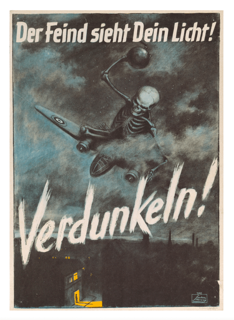 Yes, more or less. Hitler and [Joseph] Goebbels wrote about their appreciation for simple propaganda extensively, and most of the pieces collected here do generally communicate simple and often very specific messages. So, one example that I have here is a very memorable German poster from World War II towards the end, showing a skeleton riding a British plane over a German city at night during one of the bombing raids, holding a bomb that he’s about to throw down on the town below, with text across in bold simply reading “Blackout!” and smaller text at the bottom reading “The enemy sees your light.” The message obviously being that leaving your lights on exposes your house or your property to allied bombing raids.