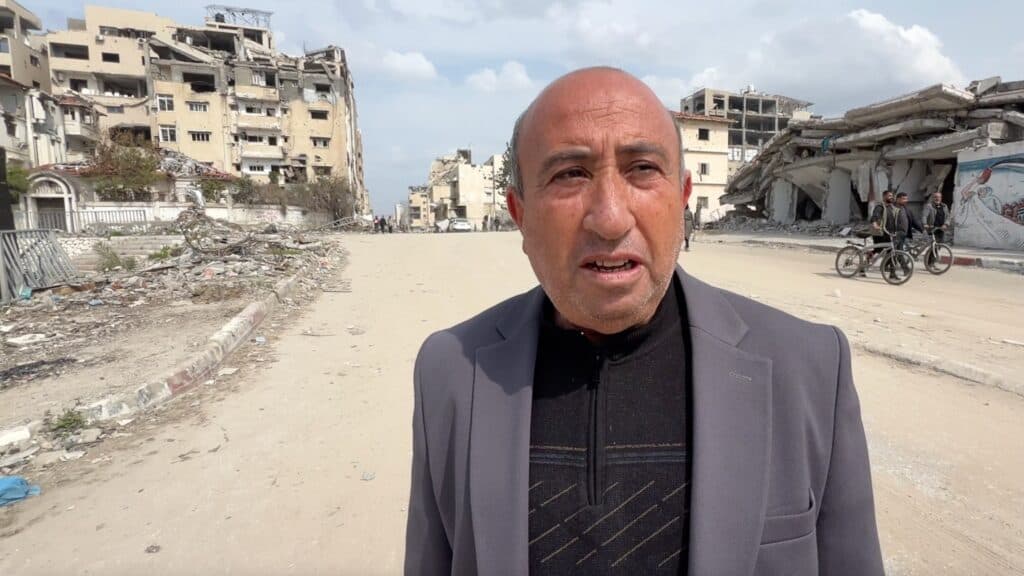 Osama al-Malahi, 48, standing in front of leveled buildings in downtown Gaza city, said that stopping aid from coming into the region has already had an impact on the 2 million people who rely on outside assistance.Mohamed El Saife/The World
