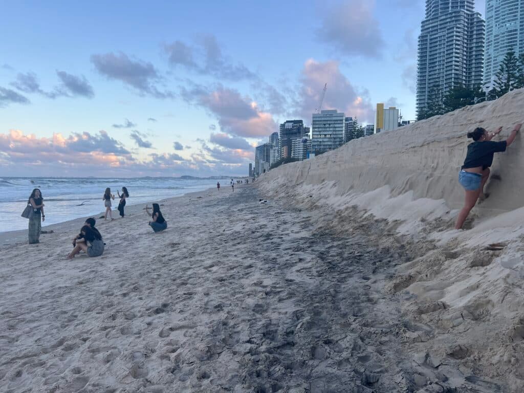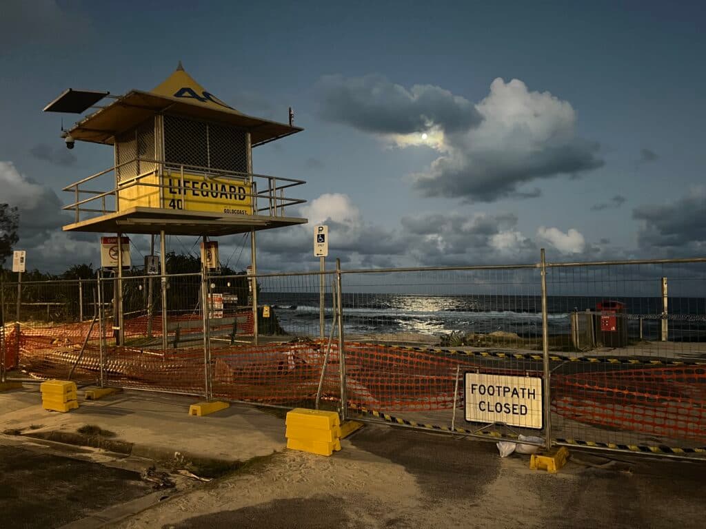 Days after the storm, the stench of washed-up seaweed piled up on the sunken shoreline emanated on the beaches of the Gold Coast. Entire walkways were destroyed, and a lifeguard stand was sat askew after falling into the ocean. Long staircases were filled to the top with sand.