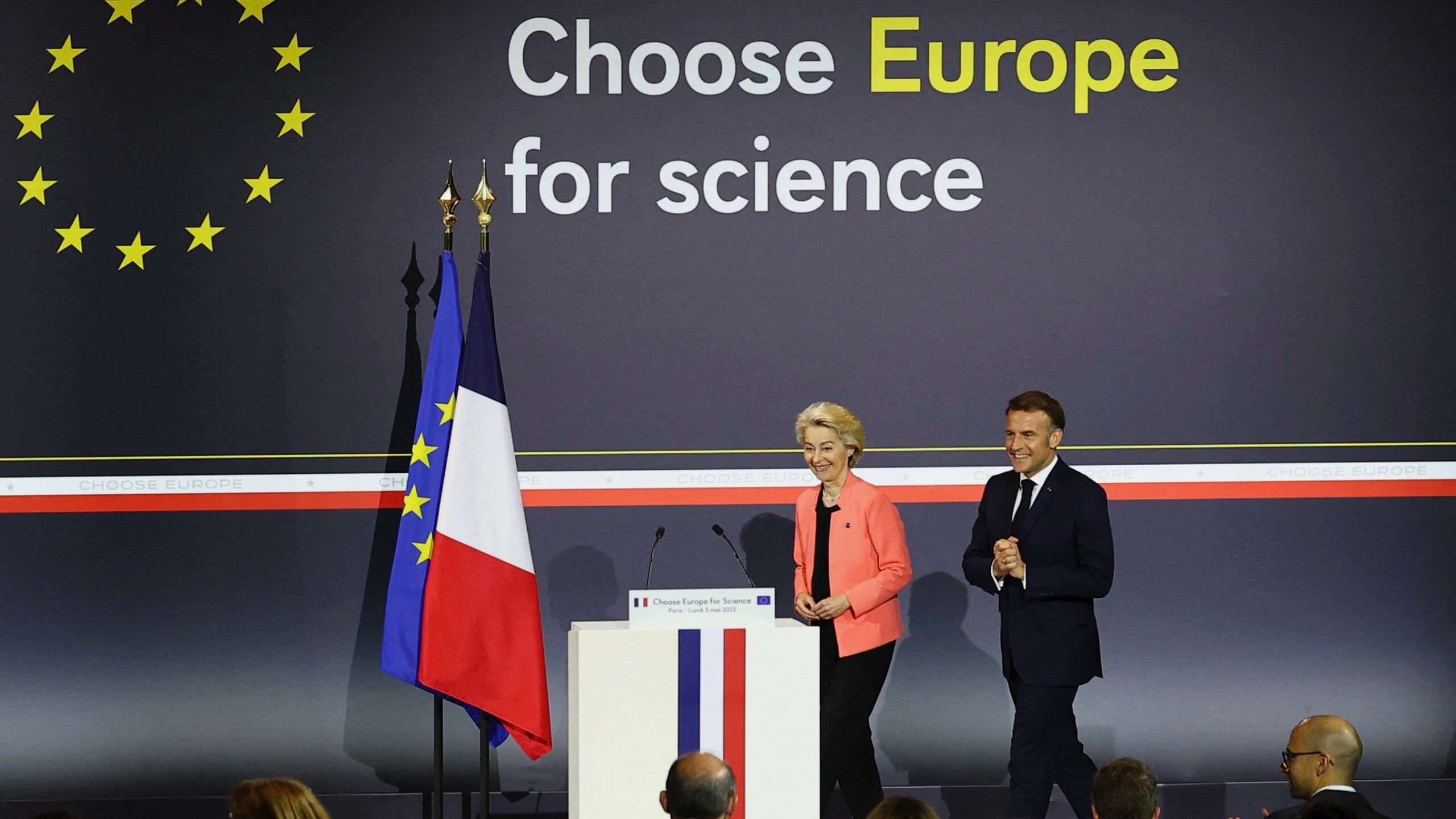 French President Emmanuel Macron and European Commission President Ursula Von der Leyen attend the “Choose Europe for Science” event at the Sorbonne University in Paris, May 5, 2025.