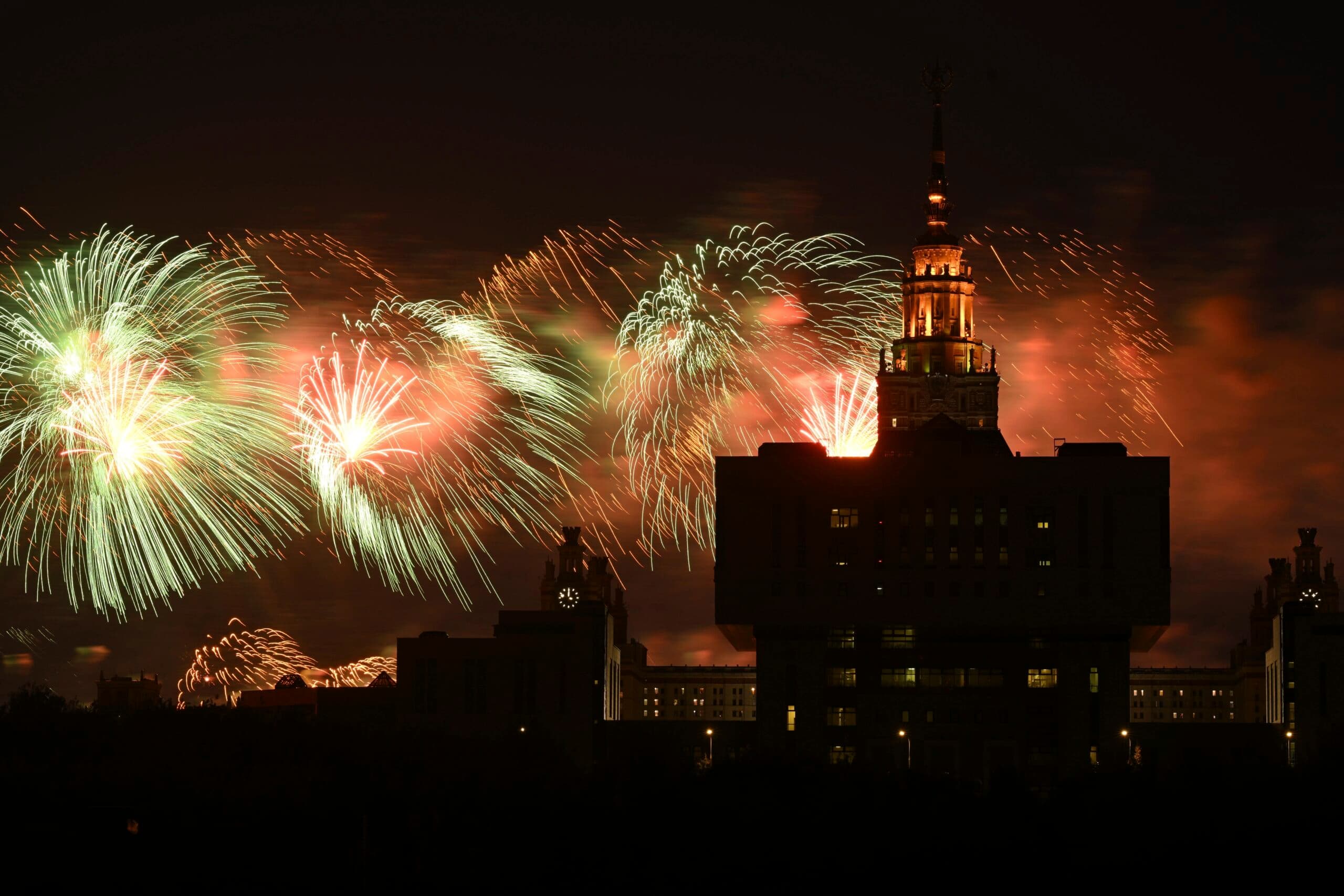 A group of people stands near a large decorated Christmas tree in front of a historic building with multiple green domes and golden crosses.
