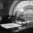 Sepia-tone image of man in jacket, profile photo, in front of 1980s computers