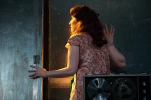 Overhead view of congregation in pews, while woman stands at podium speaking
