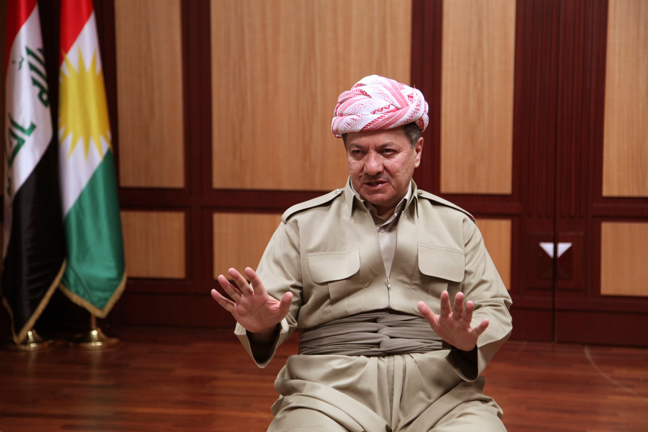 Kemal Kerkuki, commanding officer of Peshmerga forces outside of Kirkuk, speaks with his troops.