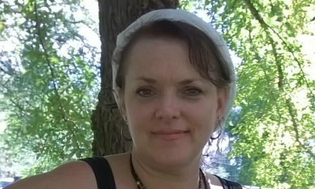 Woman with short hair wearing a black and white top raises her right arm while reading in front of a microphone.