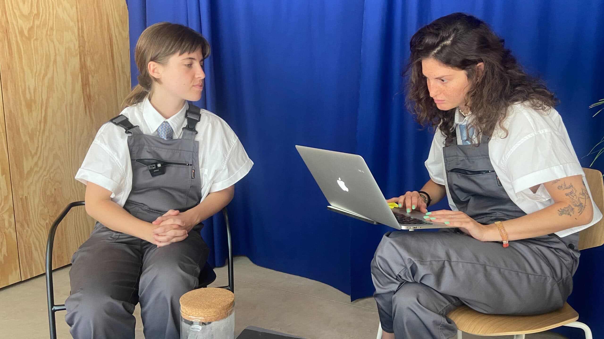 A woman sits on a bed using her phone with another woman in the hallway doing the same