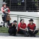 Protesters clap and cheer on the streets under a hot sun and blue sky, with one woman wearing sunglasses and head covering