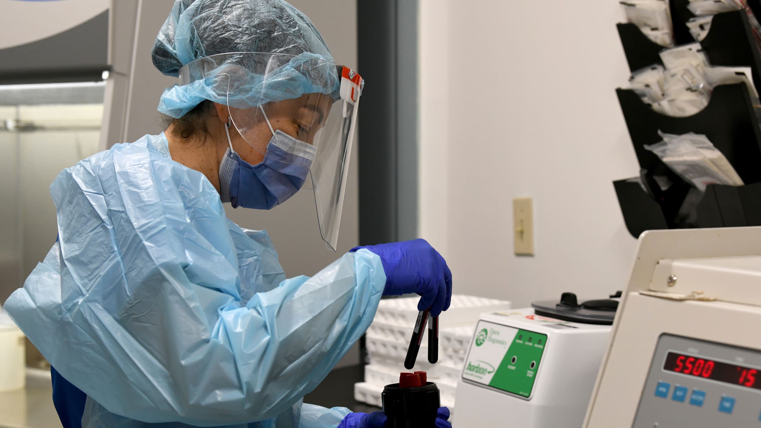 Clinical Research Nurse Aneta Gupta labels blood samples from volunteer Yash during the Imperial College vaccine trial, at a clinic in London, Aug. 5, 2020.